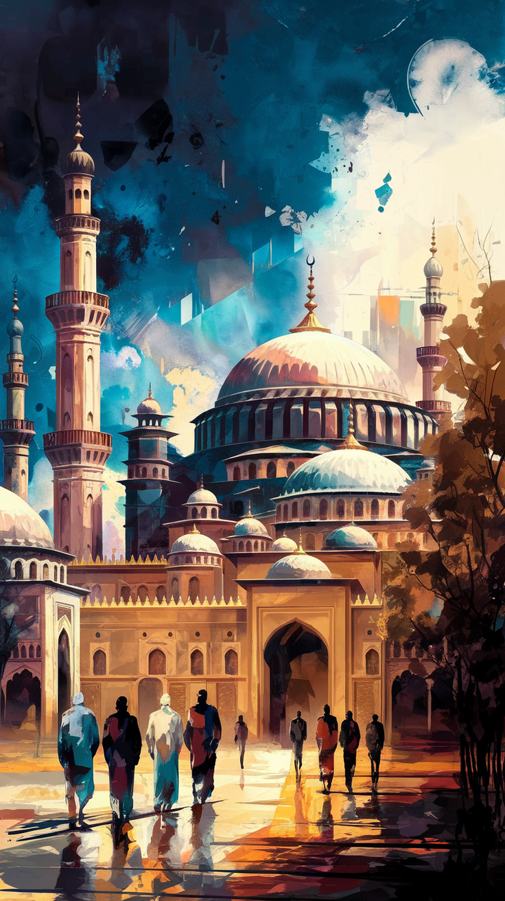 Discover this beautiful free Islamic architecture phone wallpaper lockscreen inspired by historic mosques. Featuring intricate domes, minarets, and traditional figures, this phone wallpaper creates a warm and mystical ambiance with rich golden and deep blue tones. Perfect to personalize your phone lockscreen on both iPhone and Android devices. Download this unique, artistic wallpaper for free and add a touch of elegance and cultural inspiration to your phone.