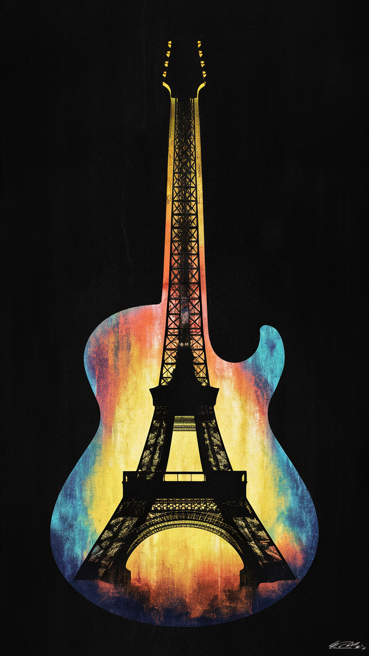 Discover this creative Eiffel Tower guitar phone wallpaper that combines iconic Parisian architecture with music vibes for a truly unique look. This free HD background features a black silhouette of the Eiffel Tower cleverly shaped like an electric guitar, set against a vibrant watercolor backdrop blending yellows, reds, blues, and purples. The dynamic colors contrast beautifully with the dark silhouette, making it a perfect dark wallpaper option that adds personality and style to your device. Compatible with all modern smartphones including iPhone and Android devices, this wallpaper is designed to enhance your lockscreen with artistic flair and high-quality visuals. Refresh your phone with a free, eye-catching background that stands out.