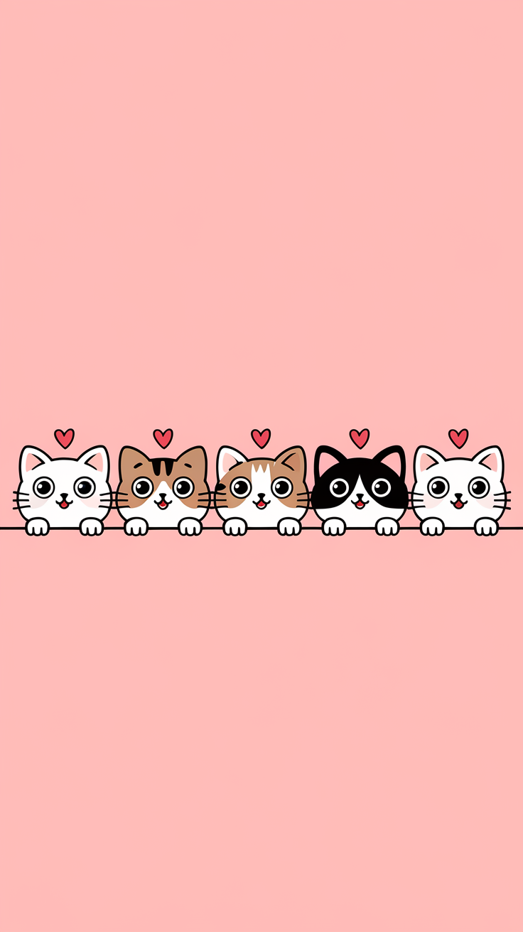 Discover this cute cat cartoon phone wallpaper lockscreen free to download. Featuring five charming cats with big eyes and gentle smiles against a soothing light pink background, this wallpaper brings warmth and playfulness to your phone. Perfect for cat lovers looking for a simple, minimalistic lockscreen that adds a touch of affection and charm to both iPhone and Android devices.