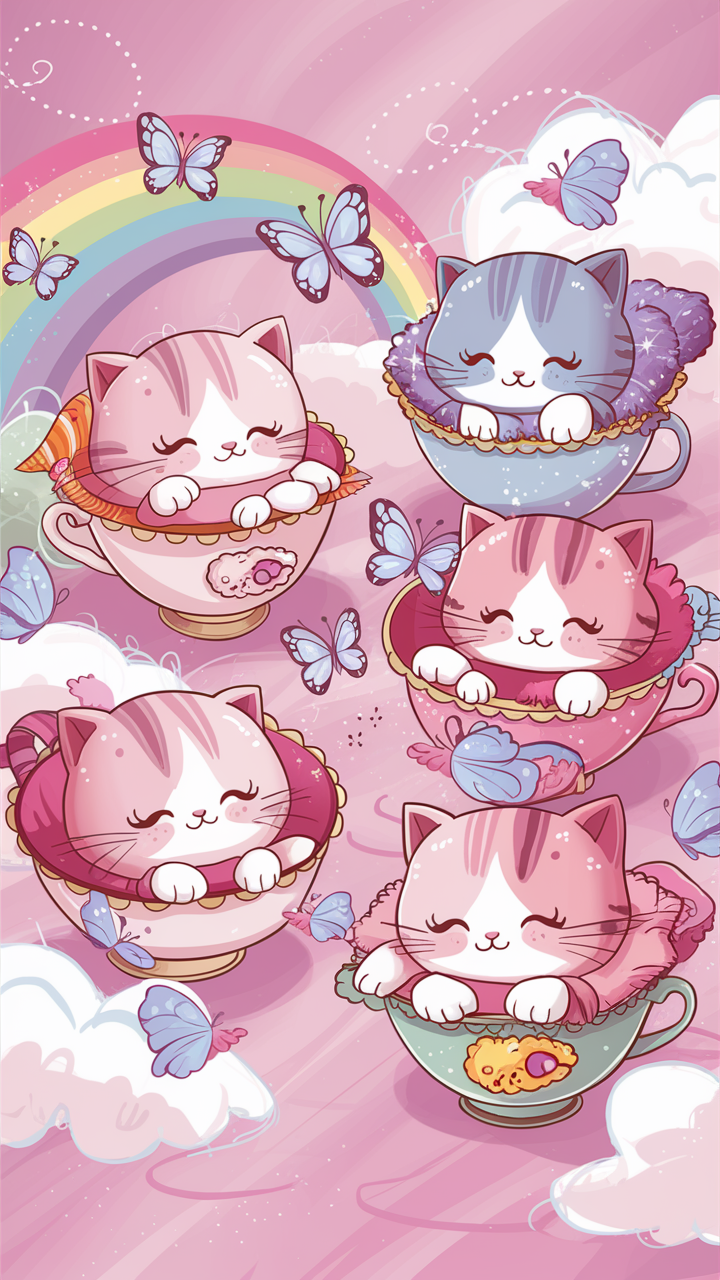 Discover this cute kitten phone wallpaper lockscreen free to download featuring five charming cartoon kittens resting in pastel-colored teacups. The playful design includes fluttering blue butterflies and a vibrant rainbow on a soft pink sky background. This free phone wallpaper creates a cozy and cheerful atmosphere, making it an ideal choice for your iPhone or Android lockscreen. Add a touch of warmth and whimsy to your device today with this adorable and unique wallpaper.