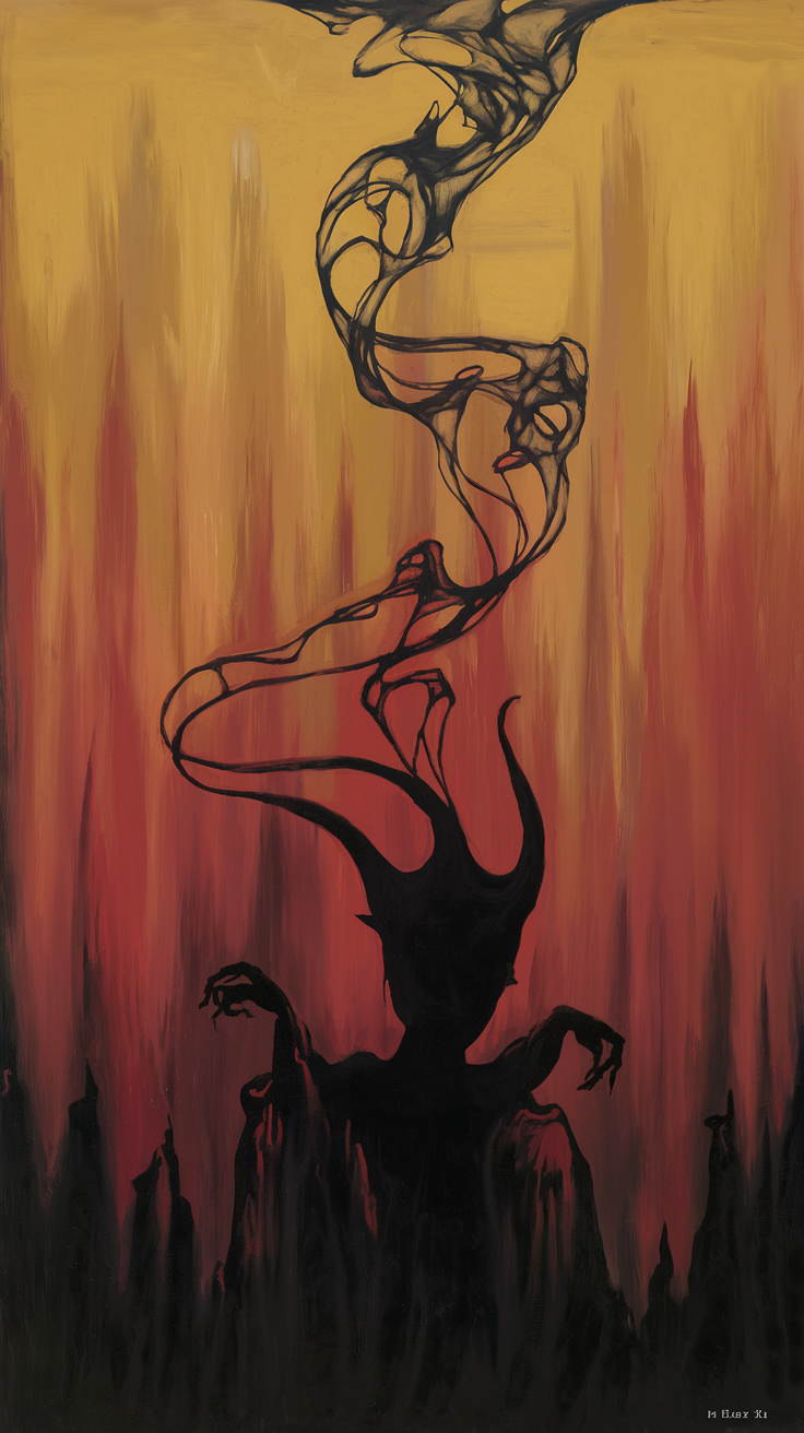Discover this dark and mysterious phone wallpaper perfect for your lockscreen. Featuring a shadowy figure with curved horns and claw-like hands, set against a striking fiery gradient background, this free phone wallpaper adds a powerful and eerie atmosphere to your device. Ideal for those who love dramatic and otherworldly themes, it enhances your phone screen with intense colors and mystical movement. Download for free and transform your lockscreen with this unique artwork compatible with all phone models.