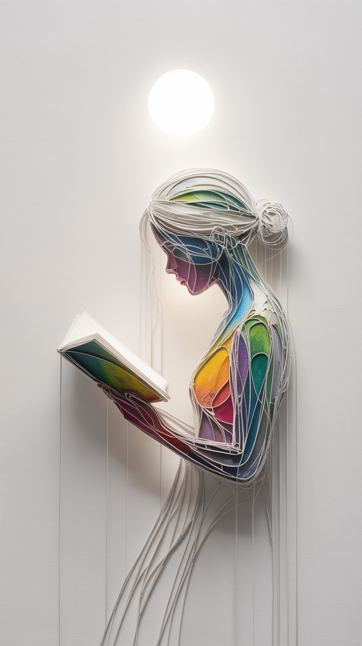Discover this free abstract woman reading book phone wallpaper that brings a unique artistic vibe to your device. This HD background features a stylized, layered design with colorful gradients in green, blue, purple, orange, and yellow, outlined by thin white thread-like lines. The glowing orb above her head adds a soft illumination that blends paper art and light sculpture styles for a delicate, ethereal feel. Perfectly optimized for both iPhone and Android devices, this dark wallpaper alternative brightens your lockscreen with vibrant colors and intricate details. Elevate your phone’s look with this artistic and dynamic wallpaper that complements any phone model.