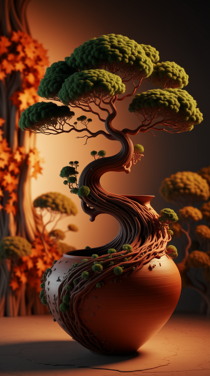 Discover this free artistic bonsai phone wallpaper that brings a surreal and serene vibe to your device. Featuring a thick, twisting bonsai tree growing from a ribbed terracotta pot, the image uses warm earthy tones such as orange and brown to create a cozy autumnal atmosphere. The soft lighting highlights intricate textures and fluffy foliage clusters, making it a perfect dark wallpaper alternative for those seeking a calming, nature-inspired HD background. Compatible with iPhone and Android devices, this free phone wallpaper enhances any lockscreen with its unique blend of organic art and dreamlike aesthetics. Elevate your phone’s look with this stunning nature-themed wallpaper today.