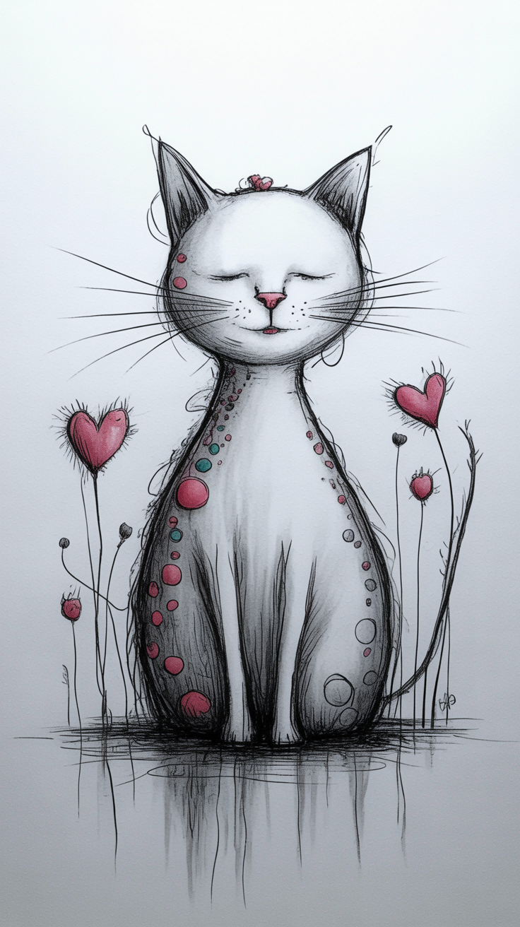 Enhance your phone screen with this free artistic cat phone wallpaper that perfectly balances a peaceful and playful vibe. This HD background features a whimsical white cat adorned with red and blue circular patterns, sitting calmly among delicate, stylized flowers on a clean white backdrop. The sketchy black outlines and soft shading create a dreamy aesthetic ideal for lovers of unique, artistic phone wallpapers. Compatible with both iPhone and Android devices, this dark wallpaper alternative brings a subtle color pop while maintaining a serene look. Perfect for those seeking a calming yet creative phone wallpaper to personalize their lockscreen with style and charm.