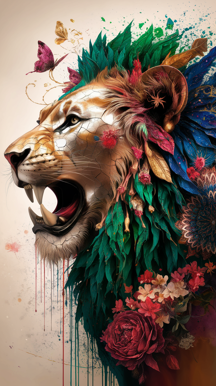 Discover this free artistic lion head phone wallpaper that blends fierce wildlife with vibrant nature. This HD background features a roaring lion in profile with a colorful mane made of lush leaves, flowers, and delicate butterflies. The rich hues of green, blue, and red combined with a soft gradient and paint splatter effects create an artistic and surreal vibe. Perfect as a dark wallpaper, this phone wallpaper adds a bold yet organic aesthetic to your device. Compatible with both iPhone and Android phones, it ensures high resolution clarity on all screen sizes. Ideal for users seeking a unique and nature-inspired lockscreen that stands out with vivid colors and intricate details.