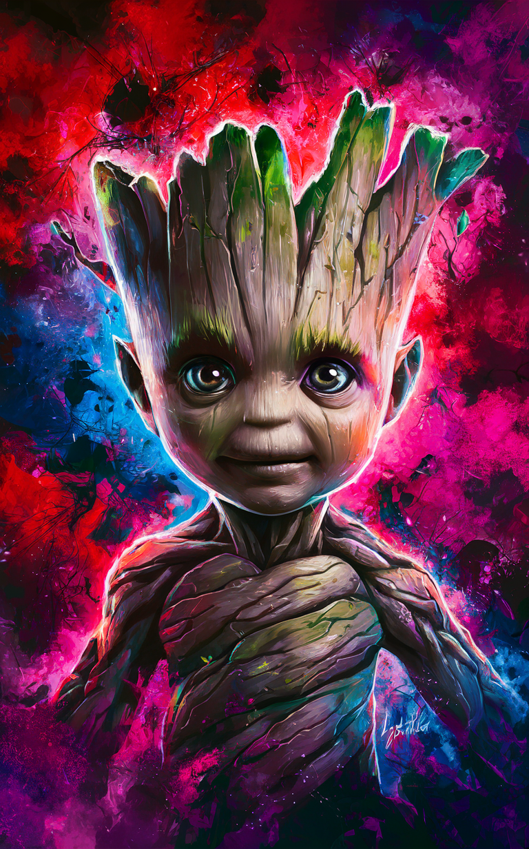 Discover this free Baby Groot phone wallpaper that brings a vibrant and artistic vibe to your device. This HD background features a detailed digital painting of Baby Groot with realistic wooden textures and lively green sprouts. The colorful abstract splash of red, purple, pink, and blue in the background enhances the dynamic and energetic aesthetic. Perfectly optimized for both iPhone and Android phones, this dark wallpaper balances bright colors with earthy tones for a striking contrast. Ideal for anyone looking to personalize their lockscreen with a unique, surreal, and vivid phone wallpaper that blends fantasy with realism.