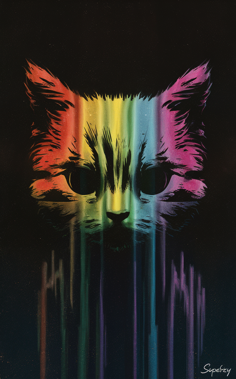 This free colorful dripping cat face phone wallpaper adds a vibrant and abstract touch to your device. Featuring a dynamic dripping paint effect in a rainbow spectrum on a sleek black background, this HD background creates a striking, artistic vibe perfect for cat lovers and fans of surreal digital art. Compatible with both iPhone and Android devices, the wallpaper fits lock screens beautifully, delivering a unique blend of realism and surreal colors. The vivid dark wallpaper enhances your phone’s display with top-tier visual appeal while maintaining an edgy and modern aesthetic. Elevate your phone’s look with this stunning free download today.