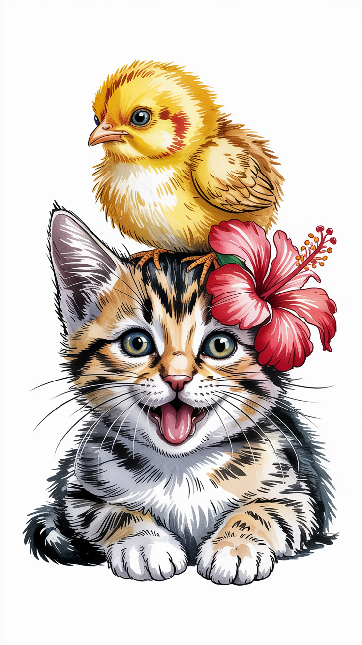 Brighten your device with this free colorful happy tabby kitten phone wallpaper. The HD background showcases a joyful tabby kitten with black, white, and tan stripes, lying down playfully with a fluffy yellow chick perched on its head. A vivid red hibiscus flower adds a vibrant pop of color, creating a charming and lively aesthetic perfect for any phone lockscreen. This dark wallpaper is designed for optimal display on both iPhone and Android devices, ensuring crisp and detailed visuals. Ideal for users seeking a cute, cheerful, and expressive wallpaper that adds personality and happiness to their home or lock screen. Download this fun and vibrant phone wallpaper today to enhance your device’s look.