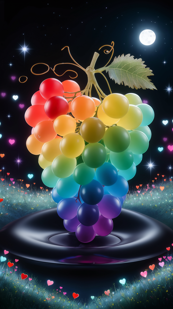 Discover this stunning free phone wallpaper featuring a bunch of rainbow grapes set against a mystical starry night sky. Each grape shines with a different vibrant color, smoothly transitioning from red to purple, creating a mesmerizing dark wallpaper perfect for lovers of fantasy and vibrant aesthetics. The glowing heart shapes and shiny black surface add a magical, whimsical vibe that enhances the overall visual depth. This HD background is compatible with both iPhone and Android devices, making it a versatile choice for anyone seeking a colorful yet dark-themed phone wallpaper. Elevate your device’s lock screen with this unique blend of nature-inspired and fantasy elements.