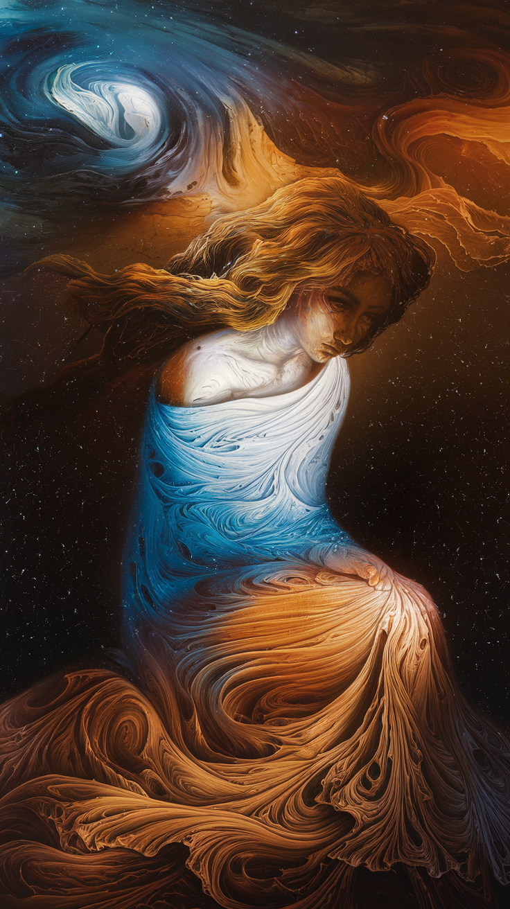 Discover this stunning free cosmic fluid art phone wallpaper that blends surreal fantasy with a dreamy cosmic vibe. The design features a woman whose flowing hair and dress merge seamlessly with swirling patterns in rich browns, golds, whites, and blues, creating a fluid, otherworldly atmosphere. Perfect as a dark wallpaper or HD background for iPhone and Android devices, this phone wallpaper enhances any lockscreen with its captivating and ethereal aesthetic. Whether you want to personalize your smartphone or find a unique artistic visual, this cosmic fluid art wallpaper brings a perfect balance of fantasy and cosmic mystique to your device.