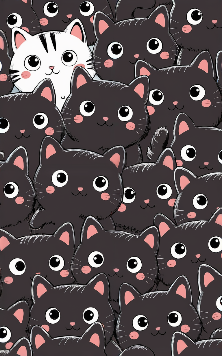This free cute black cats phone wallpaper brings a playful and adorable vibe to your lockscreen with its charming cartoon-style illustration. Featuring a large group of black cats with big round eyes and pink cheeks, it creates a fun yet simple aesthetic perfect for animal lovers. Among the black cats, a unique white cat with black stripes stands out, adding a delightful contrast. Designed as an HD background, this wallpaper is compatible with a wide range of devices including iPhone and Android phones. Its dark wallpaper theme with minimal colors makes it battery friendly and perfect for users looking for a cute, kawaii-inspired lockscreen.
