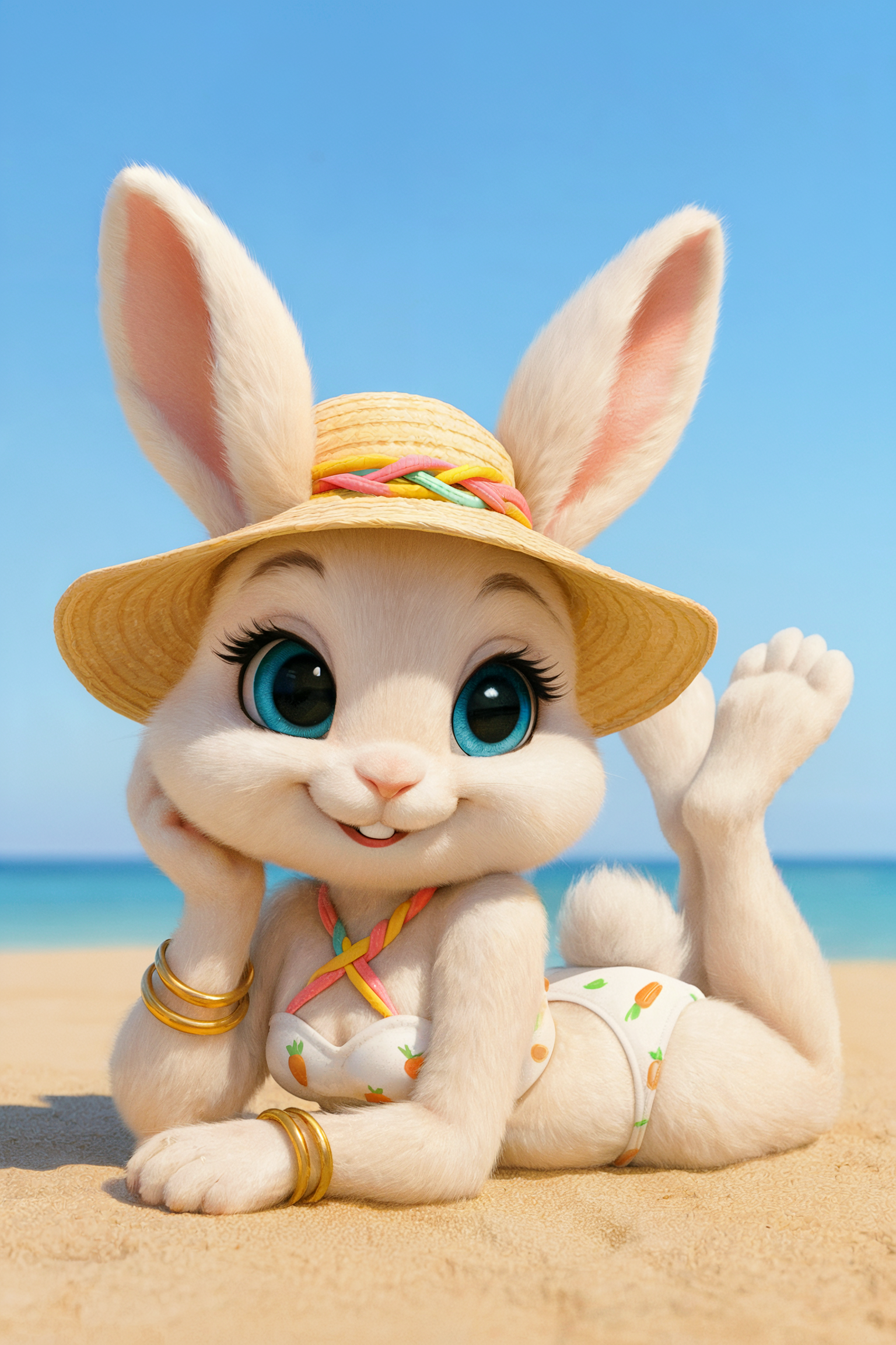 Download this free cute bunny beach phone wallpaper that brings a bright, sunny vibe to your device. Featuring an adorable white bunny with large, expressive blue eyes and a playful smile, this HD background captures the essence of a cheerful beach day. The bunny wears a light-colored bikini with carrot designs and a colorful straw hat, lying on a sandy beach with a calm ocean and clear sky in the background. This dark wallpaper with vibrant colors is compatible with most phones, including iPhone and Android models. Elevate your lockscreen with this fun and charming wallpaper for a refreshing summer aesthetic.