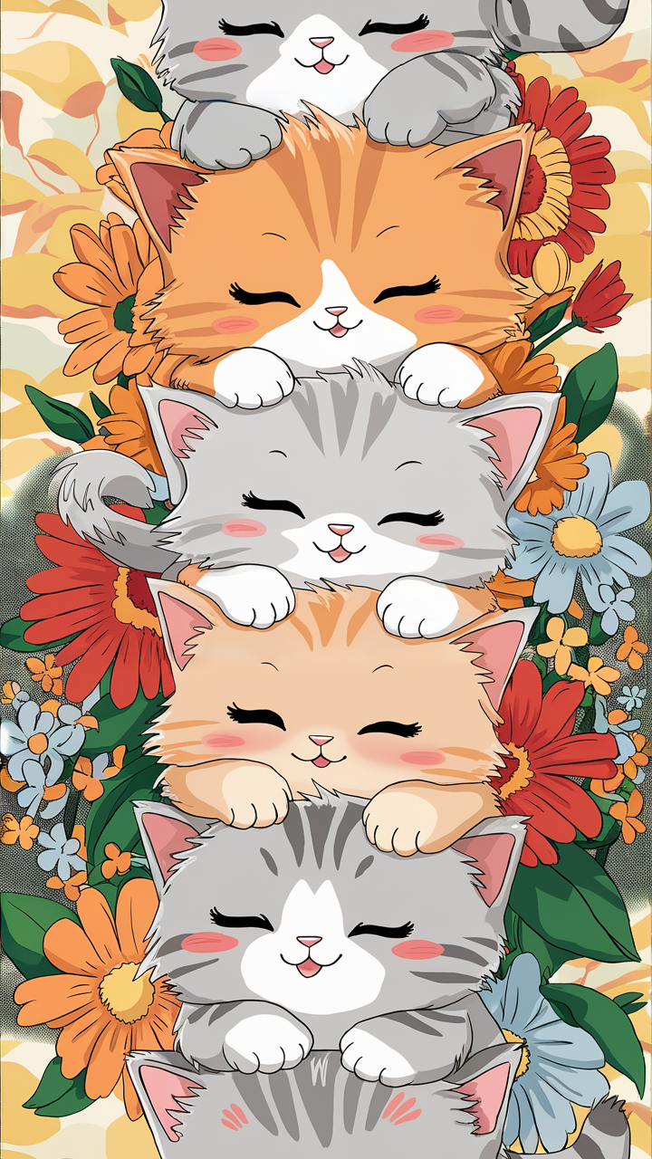 Enhance your phone with this free cute kitten phone wallpaper. Featuring a playful and colorful illustration of five happy sleeping kittens stacked vertically, this HD background brings warmth and serenity to your lockscreen. The vibrant floral backdrop adds a lively and cheerful vibe, making it an ideal dark wallpaper option for those who love adorable designs. Compatible with both iPhone and Android devices, this phone wallpaper delivers a high-quality visual experience, perfect for users looking to brighten their screens with charming and affectionate art. Download this free phone wallpaper to enjoy a delightful and content atmosphere every time you unlock your device.