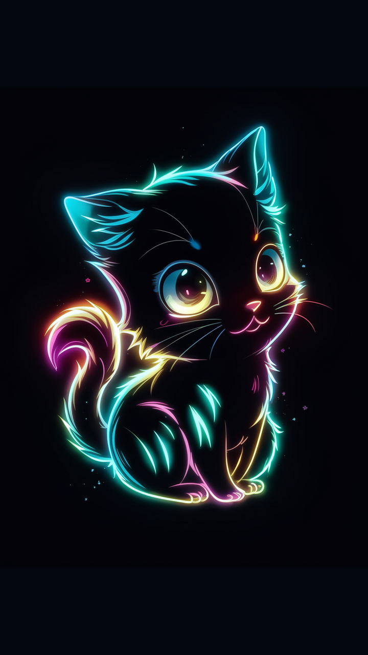 Discover this free cute neon kitten phone wallpaper that brings a magical and futuristic vibe to your device. Featuring a charming black cartoon kitten outlined in vibrant neon colors like blue, green, pink, yellow, and purple, this HD background creates a bright and whimsical look perfect for phone lock screens. The dark wallpaper style with its glowing accents enhances the visual appeal on any smartphone, including both iPhone and Android devices. This adorable kitten with large expressive eyes stands out beautifully against the black background, making it an ideal choice for users seeking unique and eye-catching phone wallpapers. Download and enjoy this colorful and animated phone lock screen wallpaper now.