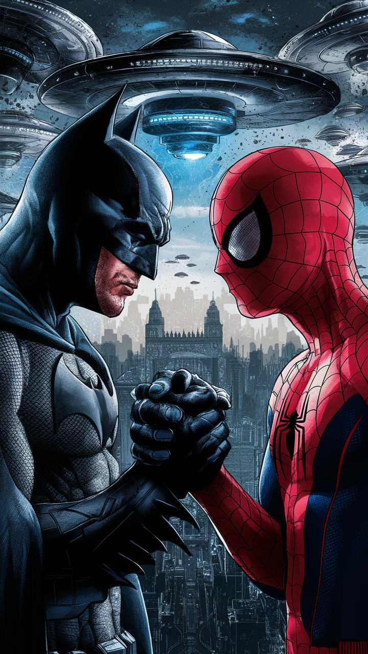 This free dark Batman and Spider-Man phone wallpaper is an ideal HD background for fans who love superhero aesthetics with a sci-fi twist. The image portrays an intense moment between Batman and Spider-Man as they lock hands against a futuristic, dystopian city backdrop filled with towering buildings and hovering UFOs. The cool blue and gray tones create a moody vibe that enhances the dark wallpaper experience, contrasting vividly with Spider-Man’s iconic red costume. Perfectly compatible with a wide range of devices including iPhone and Android smartphones, this wallpaper elevates your lockscreen with immersive superhero tension and dramatic detail. Download this unique and visually striking phone wallpaper for free to transform your device background in seconds.