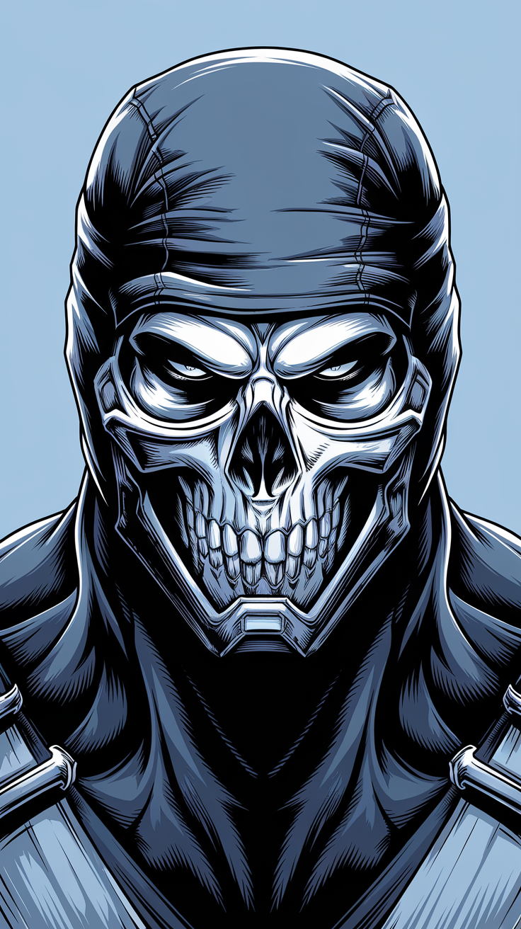 Discover this free dark fierce skull mask phone wallpaper that adds an intense and edgy vibe to your device. This high-definition background features a digital illustration of a character with a menacing skull mask, detailed sharp lines, and a gritty aesthetic. The contrast of black and gray tones against a light blue backdrop delivers a perfect blend of darkness and depth, ideal for users who love dark wallpapers or warrior-themed HD backgrounds. Compatible with both iPhone and Android devices, this lockscreen wallpaper is optimized for those looking to personalize their phones with a bold and intimidating design. Enhance your phone’s aesthetic today with this free dark wallpaper that combines texture, sharpness, and a warrior-like energy.