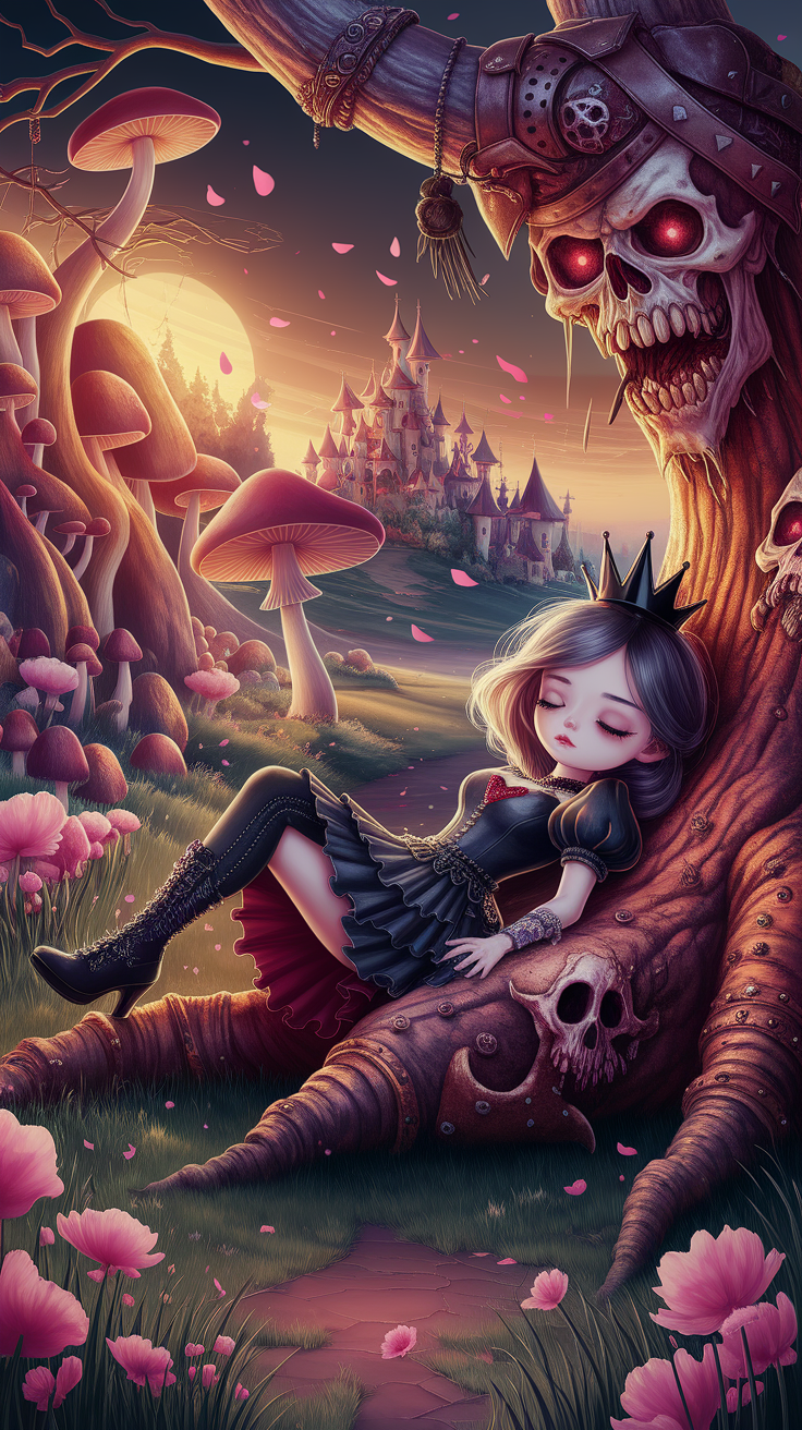 Discover this free dark gothic fantasy phone wallpaper perfect for both iPhone and Android devices. This HD background features a surreal, moody scene of a pale girl resting against a twisted tree stump adorned with eerie skulls glowing red at twilight. Oversized mushrooms and scattered pink petals create an enchanting, otherworldly vibe that blends dark fantasy and dreamy aesthetics. Ideal as a phone lockscreen wallpaper, this high-resolution dark wallpaper enhances your device with a mysterious yet delicate atmosphere. The rich colors and haunting details make it an ideal free phone wallpaper for anyone looking to add a unique and captivating look to their screen.
