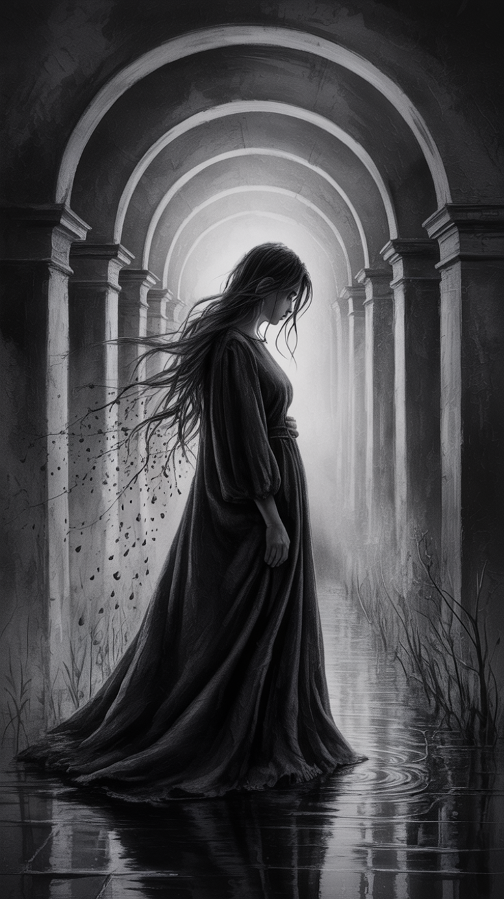 Discover this free dark phone wallpaper that brings a mysterious and ethereal vibe to your device. Featuring a monochromatic scene of a young woman in a flowing dark dress standing in a shallow pool within a long arched colonnade, this HD background captures a perfect blend of solitude and surrealism. The soft backlighting and shadow play create a moody atmosphere, ideal for fans of dark and introspective aesthetics. This wallpaper is fully compatible with all major phone models including iPhone and Android devices. Upgrade your lockscreen with this unique, high-definition dark wallpaper to express a deep and reflective mood at your fingertips.