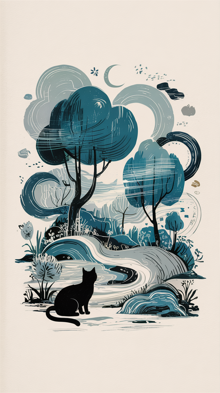 Discover this free dark phone wallpaper featuring an artistic black cat gazing into a dreamy blue and teal landscape. This HD background blends abstract trees and celestial shapes, creating a calm, mysterious vibe perfect for users who love unique and modern designs. Compatible with both iPhone and Android devices, this stunning lockscreen wallpaper offers a serene yet whimsical look that enhances any phone display. Ideal for lovers of dark wallpapers with a graphic and minimalistic style, this free download combines natural and cosmic elements for a visually captivating user experience.