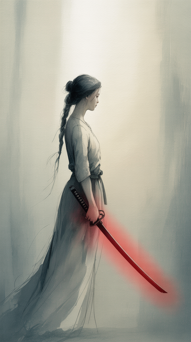 Discover a stunning free dark phone wallpaper showcasing a delicate digital painting of a woman holding a glowing katana. This HD background creates a balance between calm tones and an intense, ethereal glow, perfect for users who love minimalist yet striking phone wallpapers. Compatible with both iPhone and Android devices, this lockscreen background enhances the look of your phone while adding a mysterious and elegant vibe. Ideal for those looking to personalize their device with a unique dark wallpaper that stands out with subtle light effects and soft color palettes.