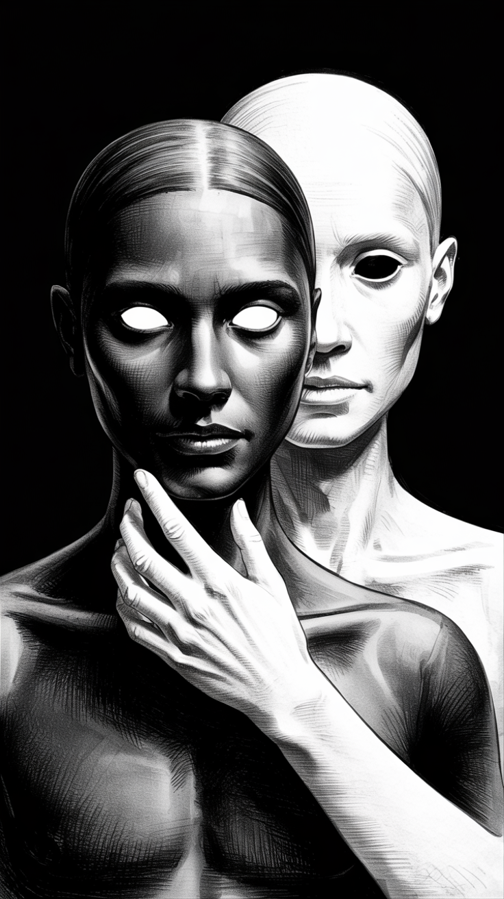 Discover this free dark surreal phone wallpaper that makes for an intense and artistic lockscreen background. The monochromatic artwork features two intertwined humanoid figures with contrasting skin tones and smooth reflective textures, creating a striking and eerie vibe. Perfect as an HD background, this dark wallpaper enhances the aesthetics of your device with its deep black background and intense shading details. Compatible with both iPhone and Android devices, it adjusts beautifully as a phone wallpaper or lockscreen, adding a unique surreal touch to your screen setup. If you seek a mysterious and artistic phone background, this free download is an excellent choice.