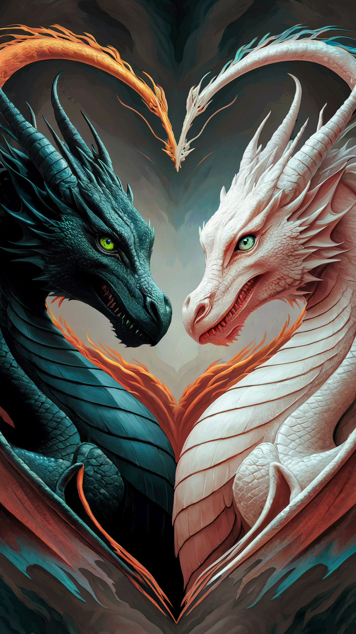 This free dragon heart phone wallpaper offers a striking HD background that combines vibrant colors and intricate details, perfect for your iPhone or Android device. Featuring two majestic dragons facing each other and forming a heart shape with their necks, the design presents a powerful yet harmonious vibe. The dark green and white dragons contrast beautifully against a muted dark and light toned backdrop, creating a captivating dark wallpaper aesthetic. Ideal for anyone seeking a unique and expressive phone wallpaper, this image brings fantasy and elegant artistry directly to your screen in high resolution. Compatible with all popular phone models, it’s an excellent choice for enhancing your device’s look with a blend of color, detail, and serenity.