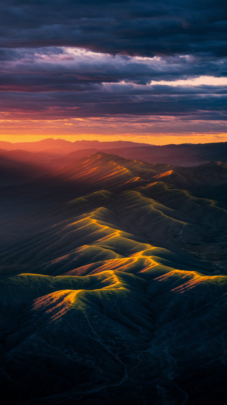 Experience the serene beauty of a dramatic mountain sunset with this free phone wallpaper. Featuring warm golden sunlight illuminating rugged mountain ridges and a moody sky filled with dark clouds, this HD background creates a majestic and calming vibe perfect for your phone’s lockscreen. The vibrant gradient from warm oranges to cool blues highlights the natural textures of the landscape, adding depth and character. This phone wallpaper is fully compatible with both iPhone and Android devices, ensuring a versatile and stunning look for all users. Ideal for those who love dark wallpapers with a nature theme, this image brings a powerful yet peaceful aesthetic to your screen.