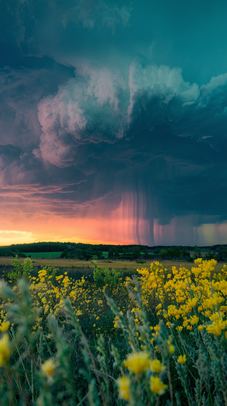 This free dramatic sunset storm phone wallpaper captures a striking landscape with a vibrant field of yellow flowers beneath dark, swirling storm clouds. The intense contrast between the warm orange-pink glow of the setting sun and the ominous storm clouds creates a captivating and moody atmosphere perfect for those who appreciate nature’s powerful beauty. This HD background is optimized for a variety of phone models including iPhone and Android devices, delivering sharp details and rich colors on any screen. If you are looking for a dark wallpaper with a natural and dramatic vibe, this free phone wallpaper offers an immersive aesthetic that enhances any lockscreen or home screen.