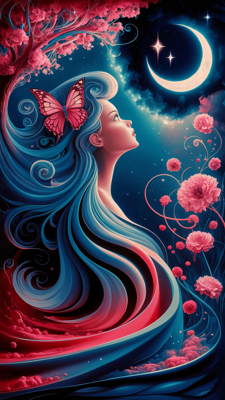 Discover this free dreamy surreal phone wallpaper that brings a magical vibe to your device. It features a woman with flowing blue to deep red hair, a glowing crescent moon, stars, and pink blossoms set against a cosmic night sky. This dark phone wallpaper combines ethereal and fantastical elements, perfect for those seeking an HD background with a mystical touch. Compatible with iPhone and Android devices, it enhances your lockscreen with vibrant blues, pinks, and reds. Elevate your phone’s visual appeal with this free surreal wallpaper that blends nature and cosmic imagery into a stunning dark aesthetic.