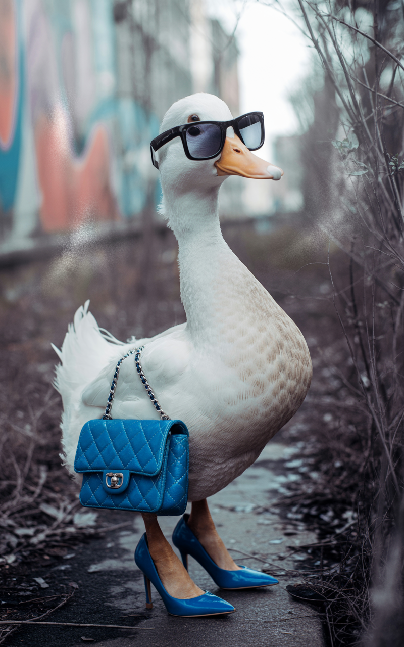Discover this free fashionable duck phone wallpaper that adds a whimsical and artistic vibe to your device. The HD background features a white duck humorously styled with oversized black sunglasses, a blue quilted handbag, and matching high-heeled shoes. Set against a blurred urban backdrop with graffiti and dry vegetation, this dark wallpaper blends playfulness with an edgy, creative aesthetic. Perfectly optimized for both iPhone and Android devices, it provides a unique lockscreen or homescreen background that stands out. This free HD wallpaper is ideal for anyone looking to add a quirky, stylish touch to their phone display.