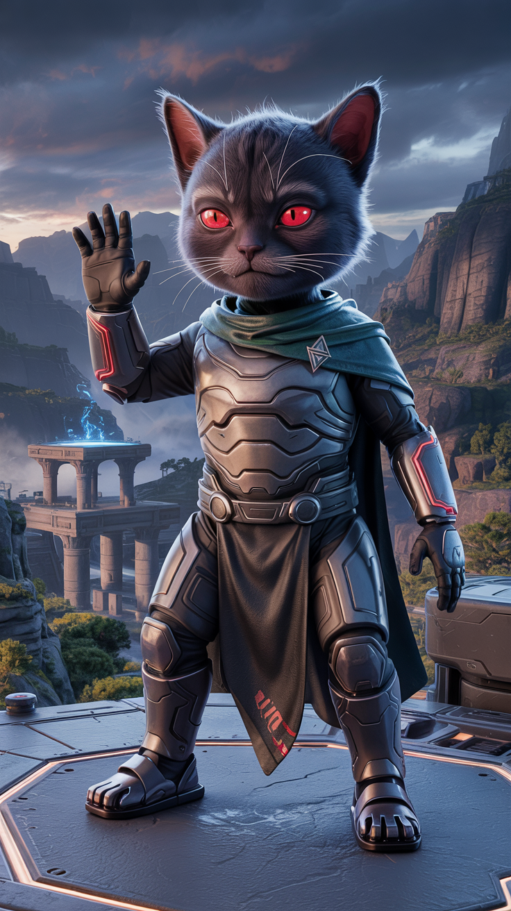 Get a free phone wallpaper that captures the intense vibe of a fierce anthropomorphic cat in futuristic armor. This HD background showcases a gray striped feline with glowing red eyes standing on a high-tech platform set against a rugged mountainous landscape with ancient, glowing temples. The combination of fantasy elements and sci-fi details creates a unique dark wallpaper aesthetic perfect for phone lock screens. This wallpaper is optimized for both iPhone and Android devices, ensuring a crisp, high-definition look on all screen sizes. Elevate your phone’s style with this striking and immersive free wallpaper, perfect for anyone seeking a bold and detailed background with a futuristic fantasy twist.