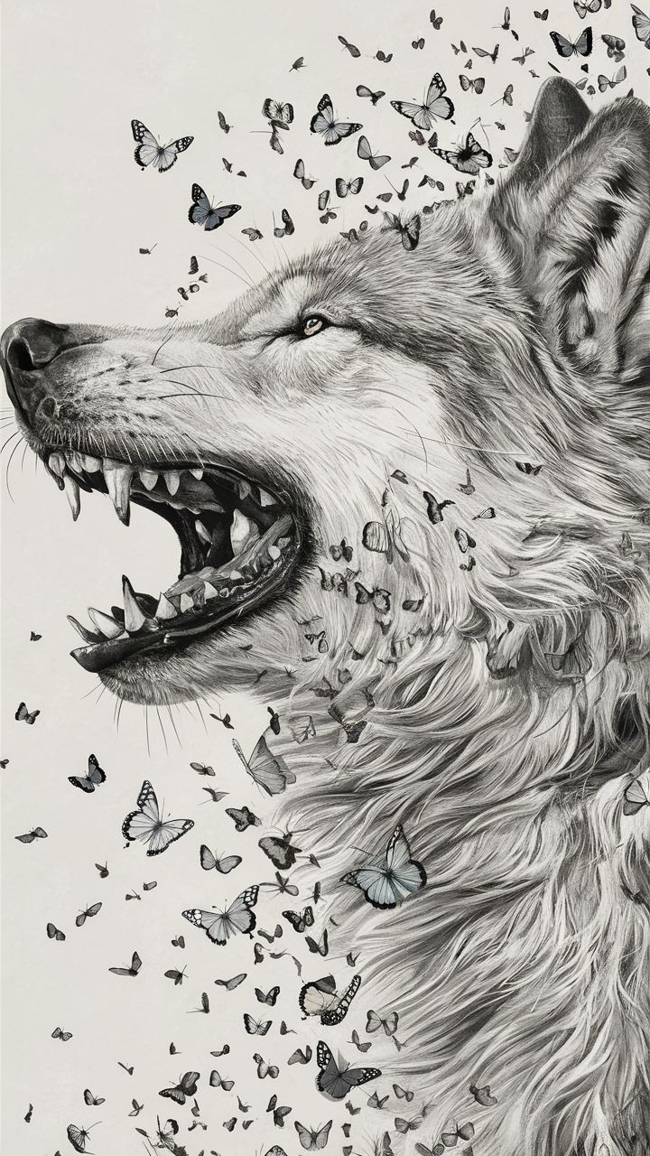 Download this free phone wallpaper featuring a fierce monochrome wolf with its mouth open, revealing sharp teeth and detailed fur. Swirling butterflies emerge around the wolf, offering a delicate and ethereal contrast to the wild and powerful vibe. This HD background captures both strength and grace, making it an ideal dark wallpaper for those who seek a bold artistic aesthetic. Compatible with all phone models including iPhone and Android devices, this lock screen wallpaper adds a unique and captivating touch to your device. Enhance your phone’s look with this free, high-quality wallpaper that blends wild nature with gentle beauty.