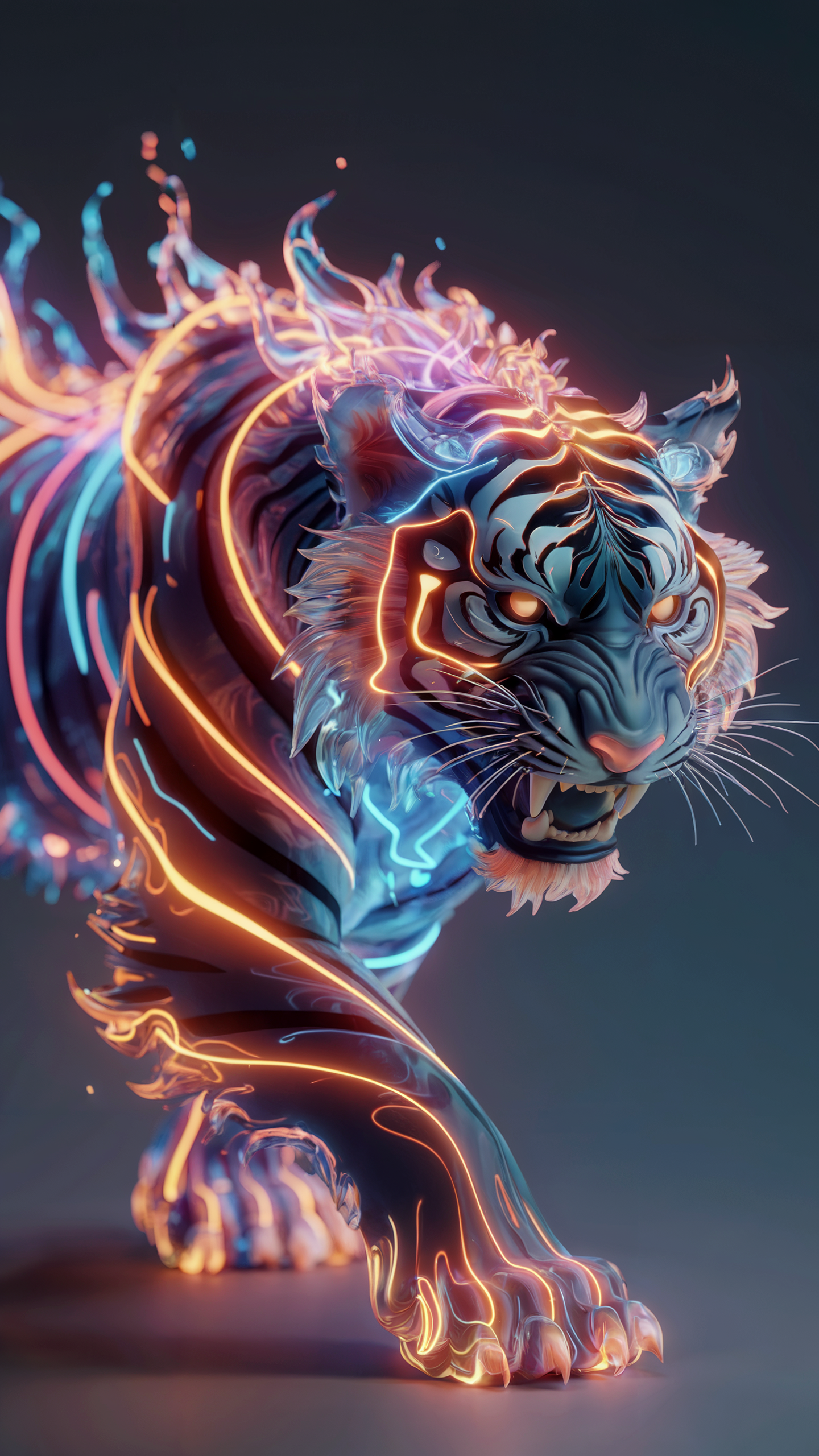 Discover this free futuristic neon tiger phone wallpaper that adds a bold and dynamic vibe to your device. The image features a surreal tiger made of glossy, glass-like material illuminated with vibrant neon lines in orange, blue, and purple. Its glowing eyes and electric aura create an intense and powerful look, perfect for users who love dark wallpaper aesthetics. This HD background is optimized for various phone devices, including iPhone and Android models, ensuring sharp and vivid visuals. Elevate your lockscreen with this unique, otherworldly phone wallpaper that combines strength and grace with a glowing futuristic style.