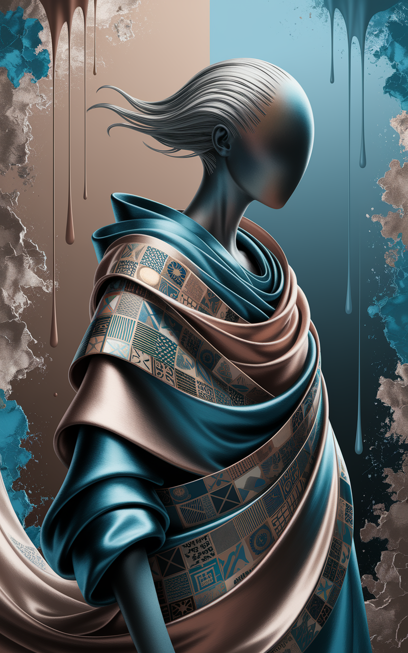 Discover this stunning free futuristic phone wallpaper showcasing a faceless humanoid figure with a sleek metallic texture set against a split beige and blue gradient background. This HD background beautifully blends classical elegance and modern design, featuring layered fabrics with rich geometric patterns. Perfect for those who love dark wallpapers with a mysterious and sophisticated vibe, this wallpaper is fully compatible with all phone devices, including iPhone and Android models. Elevate your lockscreen aesthetic with this unique, high-quality background that adds a touch of futuristic mystique to your device.