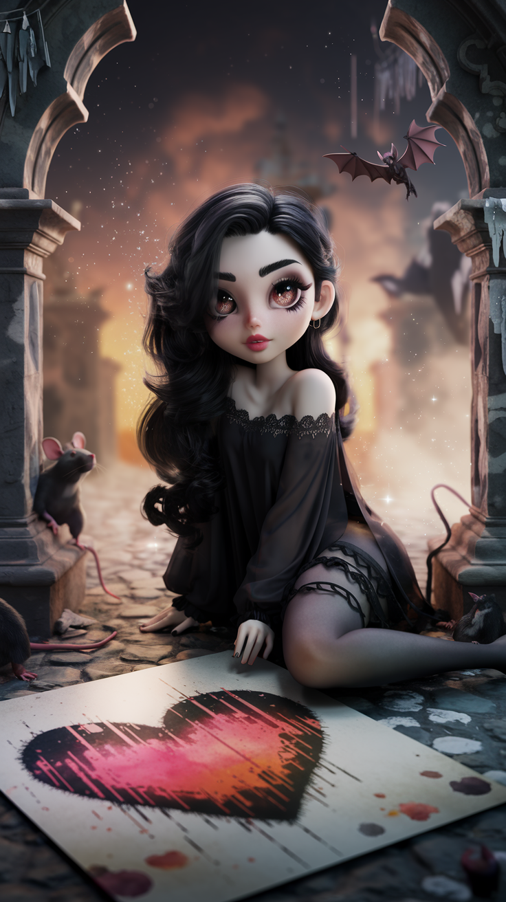 Discover this stunning free gothic fantasy phone wallpaper that perfectly blends mystery and whimsy with dark aesthetic tones. This HD background features a doll-like character seated on cobblestone within a castle setting, surrounded by rats and a bat under a warm glowing sunset. The shadowy foreground and mystical light create a dramatic contrast ideal for those who love dark wallpapers for their mobile devices. Compatible with both iPhone and Android phones, this wallpaper adds a unique gothic vibe to your lockscreen or home screen. Elevate your device with this visually captivating dark wallpaper, ensuring an exclusive and stylish HD background experience.