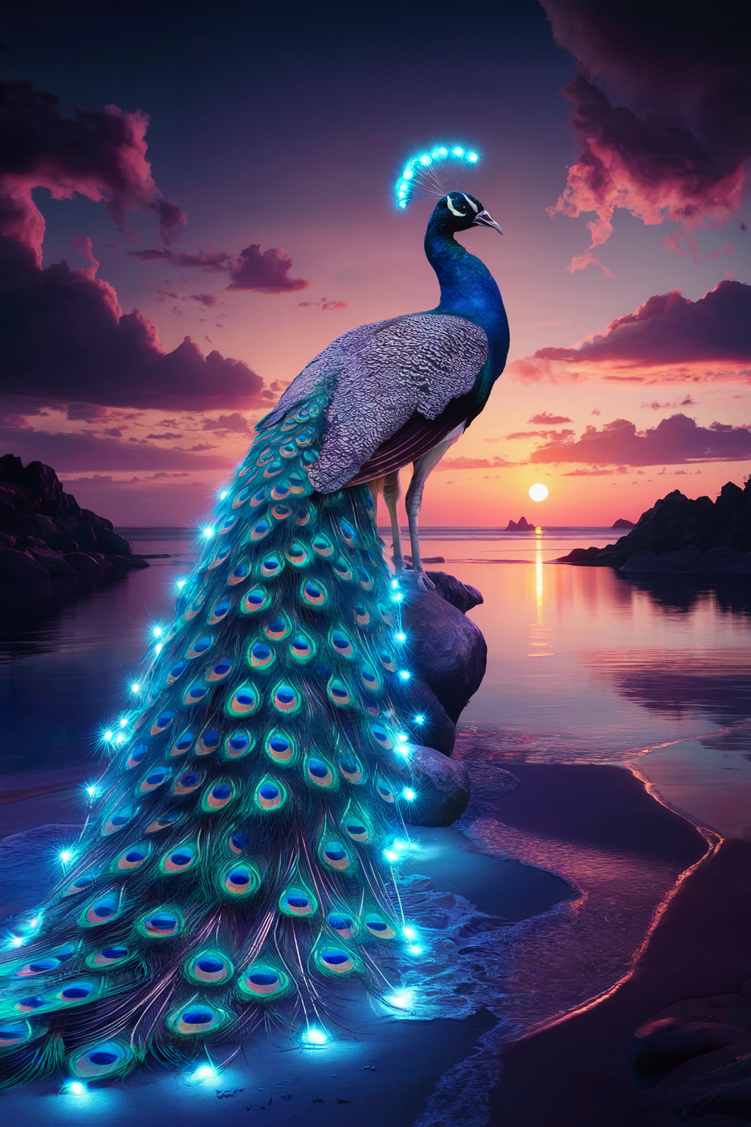 Discover a stunning free phone wallpaper showcasing a majestic peacock perched on a rock by a serene body of water during sunset. This dark wallpaper captures the vibrant hues of purple, pink, and orange reflected on the calm lake, creating a magical ambiance. The peacock’s glowing blue feathers add an enchanting touch to the natural scenery, offering a perfect blend of elegance and fantasy. This HD background is optimized for all phone models, including iPhone and Android devices, making it a versatile choice for your lockscreen or home screen. Elevate your device aesthetic with this breathtaking wallpaper that evokes tranquility and wonder.