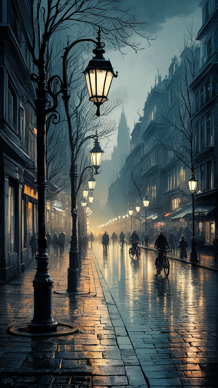 Discover this free moody European street phone wallpaper perfect for adding an atmospheric vibe to your device. Featuring a nostalgic dusk scene with vintage lampposts casting warm amber lights onto wet cobblestone pavement, this dark wallpaper creates a beautifully melancholic aura. The image highlights classic architecture and silhouetted figures, enhancing the poetic ambiance. This HD background is compatible with all phone models, including iPhone and Android devices, ensuring a crisp and immersive lockscreen experience. Ideal for users who love cinematic, moody aesthetics and dark themes, this wallpaper brings old-world charm and modern device compatibility together seamlessly.