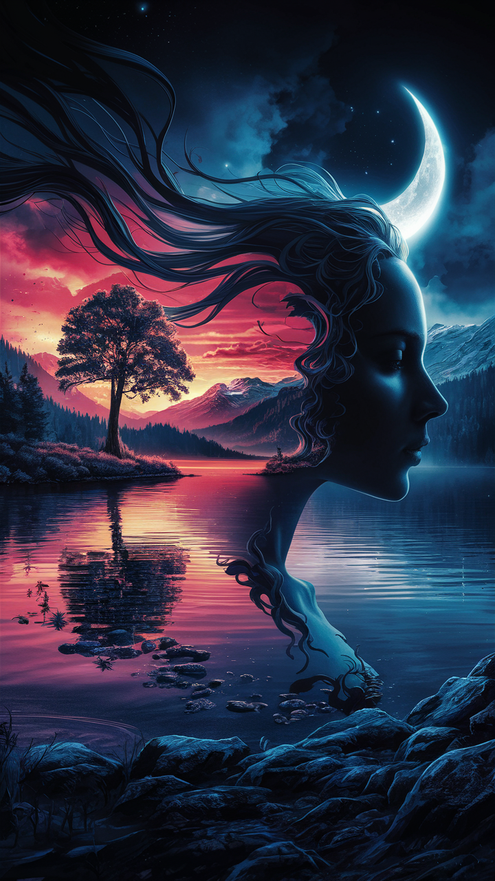 Discover this free mystical phone wallpaper that brings together surreal art and natural beauty in stunning HD quality. Featuring a detailed woman’s profile illuminated by a crescent moon, this dark wallpaper creates a dreamy and poetic vibe with its seamless merge of flowing hair and serene lake scenery. The vibrant sunset hues alongside cool blues and purples paint a magical atmosphere perfect for anyone seeking a unique and tranquil phone background. Compatible with both iPhone and Android devices, this HD background enhances your lockscreen with its fantasy-inspired aesthetic. Elevate your phone’s style today with this free surreal phone wallpaper emphasizing unity, tranquility, and mysticism.