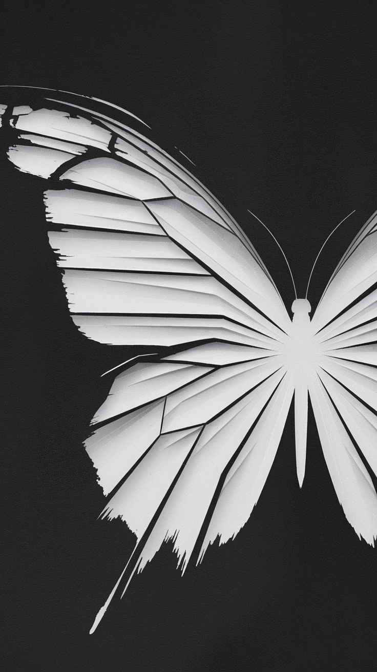 Discover this captivating free phone wallpaper showcasing an abstract black and white butterfly with a unique geometric fragmented design. The striking contrast between the light butterfly and the solid black background creates a dark wallpaper ideal for minimalistic and modern aesthetics. Perfect for both iPhone and Android devices, this HD background enhances your lockscreen with artistic flair and depth. The left wing’s torn, jagged details add an edgy touch, making it stand out as a bold visual statement. Enhance your device’s appearance today with this abstract butterfly wallpaper that fits perfectly on all phone screens, combining style with compatibility for an immersive viewing experience.