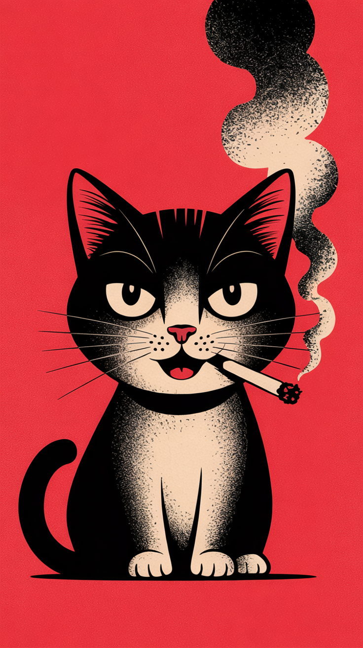 Discover a unique free phone wallpaper featuring a stylized black and white cartoon cat sitting against a bold red background. This HD background offers a vintage poster vibe with a grainy texture and limited color palette, blending cuteness with edgy details like the lit cigarette and curling smoke. The wide-eyed cat with pink nose and ears creates a playful and slightly mischievous aesthetic. Perfect as a dark wallpaper alternative, this image suits all modern smartphones including iPhone and Android devices. Add a retro yet cool vibe to your lockscreen or home screen with this high-quality free phone wallpaper.