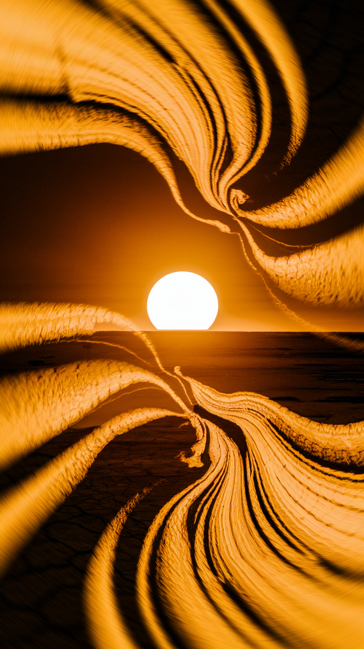 This free phone wallpaper showcases a bright glowing sun positioned near the horizon, captured in stunning HD quality. The swirling abstract orange patterns create a dynamic and energetic vibe, blending warm tones that evoke a surreal sunrise or sunset atmosphere. The textured dark cracked ground adds contrast, enhancing the visual depth and artistic feel of this dark wallpaper. Perfectly optimized for both iPhone and Android devices, this vibrant HD background promises to elevate the look of any phone lock screen or home screen. The seamless blend of natural elements with imaginative distortion makes it a unique choice for users seeking a free dynamic phone wallpaper with rich colors and motion-inspired design.