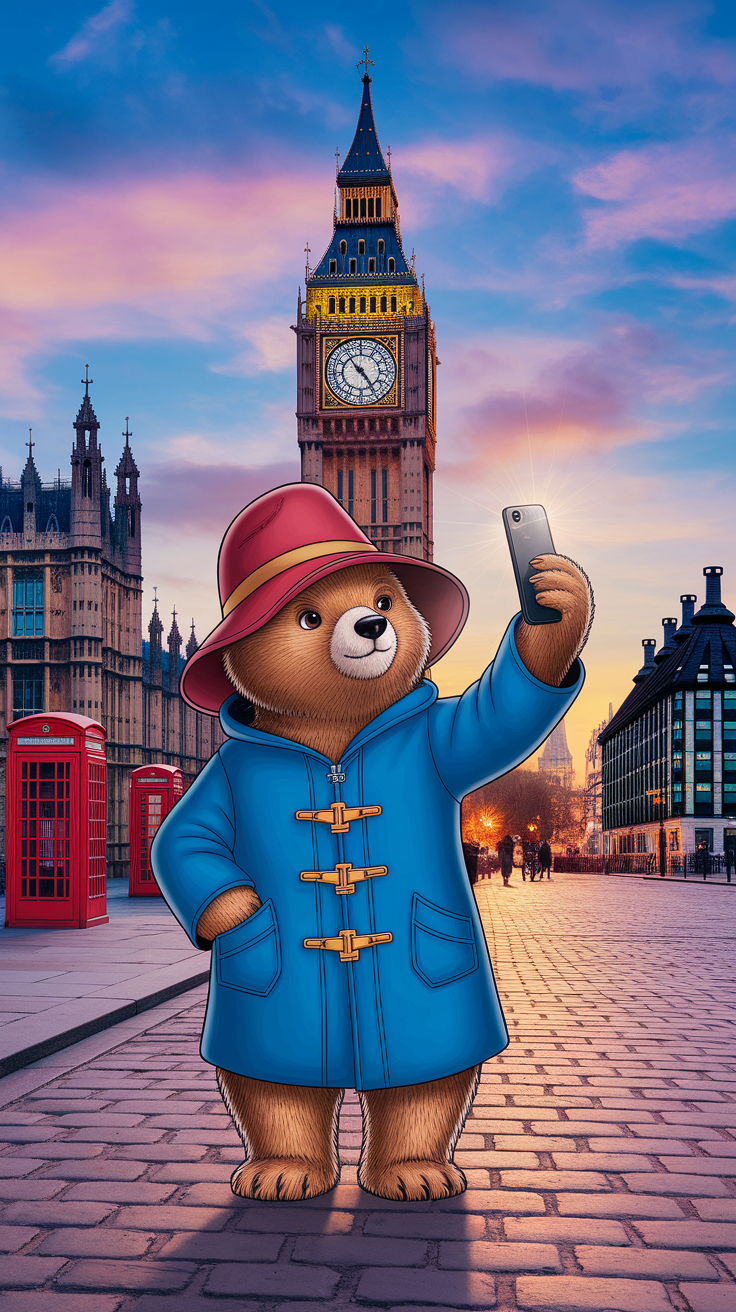 This free phone wallpaper captures a charming anthropomorphic bear in a blue duffle coat and red hat taking a selfie on a cobblestone London street. The iconic Big Ben clock tower and red British telephone booths create a picturesque backdrop under a colorful twilight sky with hues of pink, purple, and blue. The warm, inviting glow of the setting sun enhances the cozy and whimsical aesthetic. Perfect for those who want a dark wallpaper with pops of color and an HD background that fits most smartphones including iPhone and Android devices. Add a unique, storybook vibe to your lockscreen with this vibrant and playful phone wallpaper.