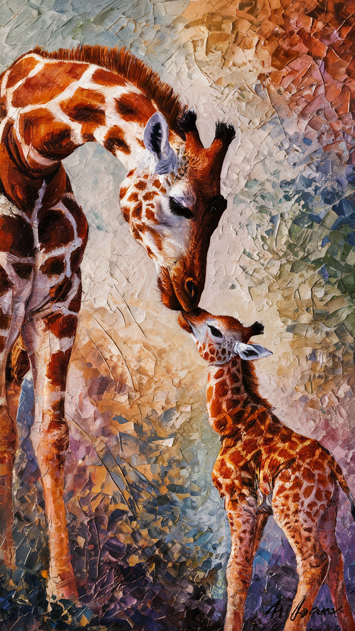 Discover this free phone wallpaper featuring a colorful painting of two giraffes sharing a tender moment. The vibrant hues of blues, beiges, and oranges blend seamlessly in the abstract background, creating a warm and inviting vibe. This HD background is perfect for users looking to add a touch of affection and nature-inspired art to their device screen. Ideal for both iPhone and Android phones, this dark wallpaper alternative brightens your lockscreen with rich textures and dynamic brushstrokes. Enhance your phone with this unique, artistic wallpaper that combines emotional warmth and visual depth.