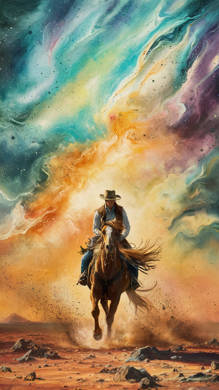 Experience the thrill of the wild west combined with a surreal cosmic vibe in this free phone wallpaper. Featuring a cowboy riding a horse at full gallop across a rugged desert landscape, this HD background captures movement, dust, and vibrant colors. The abstract sky blends blues, teals, oranges, and purples, giving your phone an adventurous and dreamlike aesthetic. Ideal for both iPhone and Android devices, this dark wallpaper adds depth and intensity to your lockscreen or home screen. If you’re looking for a unique free phone wallpaper that blends western adventure and otherworldly beauty, this is a perfect choice.