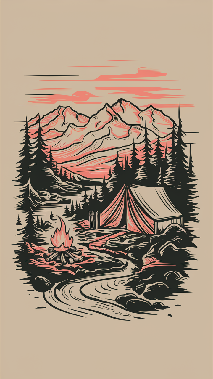 Enhance your phone with this free phone wallpaper showcasing a cozy mountain campsite nature scene. This HD background captures a tranquil outdoor vibe with a warm palette of pinks, blacks, and beige, perfect for lovers of serene wilderness aesthetics. The image features a glowing campfire, a pitched tent among tall pine trees, and a gently flowing stream, all set against rugged mountains with soft pink clouds hinting at sunrise or sunset. This stylized dark wallpaper brings a comforting and peaceful atmosphere to your lockscreen or home screen. Compatible with most iPhone and Android devices, this nature-inspired wallpaper is an excellent choice for those seeking a relaxing and scenic backdrop for their phone.