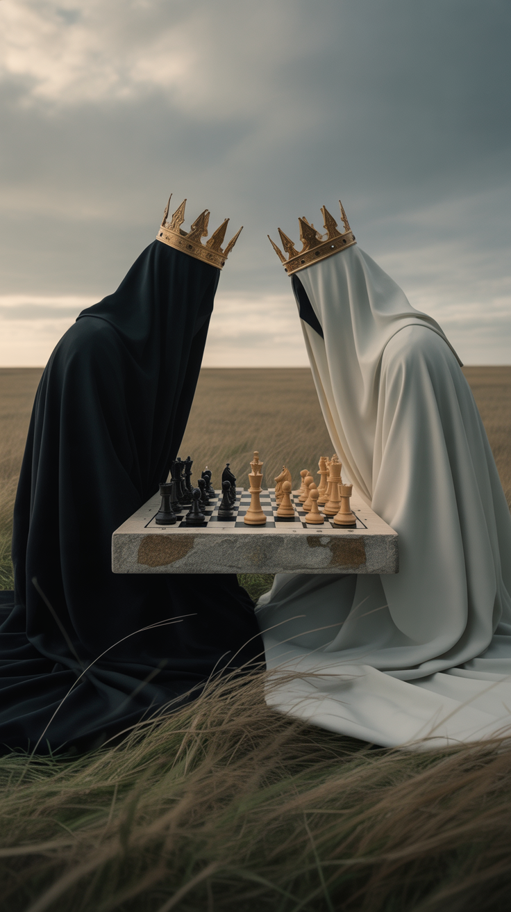 This free phone wallpaper captures a dark and dramatic scene perfect for users seeking a unique and moody HD background for their devices. The image showcases two figures draped in flowing black and white fabrics, each wearing golden crowns, seated in a grassy field. Between them hangs a detailed stone chessboard with wooden chess pieces, creating an intense and regal atmosphere that evokes the quiet tension of a chess match. The cloudy sky enhances the dark wallpaper vibe, making this design ideal for phone backgrounds that emphasize elegance and mystery. Compatible with most smartphones, this free wallpaper works beautifully on both iPhone and Android devices, providing a high-quality visual experience for users looking to customize their lockscreen with something distinctive and artistic.