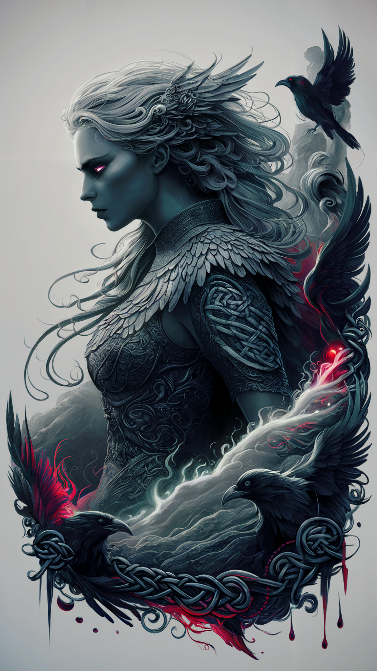 Discover a stunning free phone wallpaper featuring a dark fantasy female warrior that brings an intense and mystical aura to your device. This HD background showcases a somber heroine with flowing silvery hair and glowing pinkish-red eyes, surrounded by enigmatic black ravens with red-tinted feathers. The intricate armor and Celtic-inspired knotwork add regal and ancient lore vibes to the design. Perfectly suited for iPhone and Android devices, this dark wallpaper background enhances any lockscreen with its cool color palette contrasted by vibrant reds. Elevate your phone aesthetic with this powerful and magical fantasy wallpaper today.
