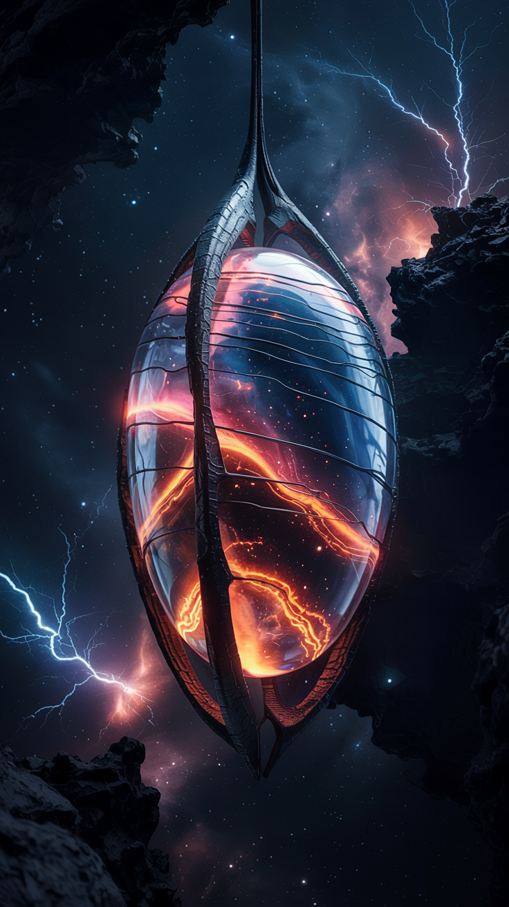 Discover this stunning free phone wallpaper showcasing a dark futuristic cosmic orb encapsulated in a metallic exoskeleton. This high-definition background features fiery orange and red swirling patterns that resemble molten lava, set against a vast space backdrop filled with stars, nebulae, and dramatic lightning. The dark wallpaper emits a powerful sci-fi and cosmic vibe perfect for users seeking a mysterious and energetic aesthetic. Compatible with both iPhone and Android devices, this HD background adds a unique otherworldly touch to your phone lock screen or home screen. Experience the allure of deep space with this captivating free wallpaper that blends alien artifacts and cosmic phenomena for an unforgettable visual impact.