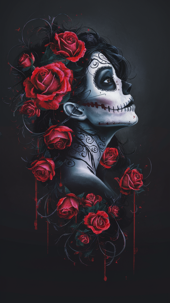 This free phone wallpaper showcases a captivating dark gothic sugar skull side profile, accented by vivid red roses and swirling black vines. The HD background features a stark contrast between the pale skull makeup and the deep black backdrop, creating a somber yet elegant aesthetic perfect for gothic art lovers. Ideal for iPhone and Android devices, this dark wallpaper adds a unique artistic edge to your lockscreen. The intricate skull details paired with floral elements deliver a blend of mystery and beauty, making it a stylish and high-quality phone background choice for anyone seeking an intense yet beautiful vibe.