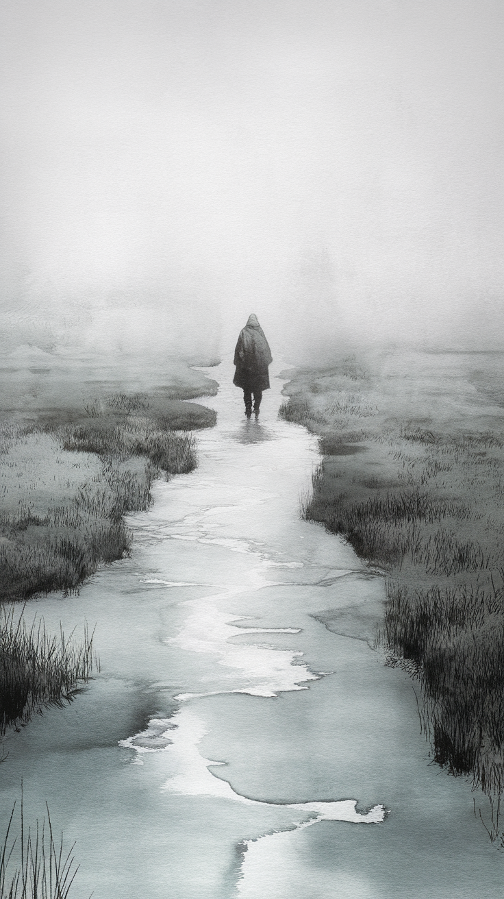 Discover this free phone wallpaper featuring a dark and misty path that captures a cold, eerie, and melancholic vibe. This HD background showcases a solitary figure walking away through a foggy, desolate landscape with cracked ice and patches of grass, creating a hauntingly beautiful atmosphere. Perfectly suited for iPhone and Android devices, this lockscreen wallpaper adds a mysterious and moody aesthetic to your phone. Ideal for fans of dark wallpaper and atmospheric images, it enhances your device with a unique and immersive look that stands out from typical backgrounds.